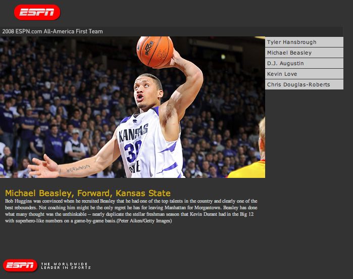 | Michael Beasley | Mar. 13, 2008 | ESPN All-American | |||