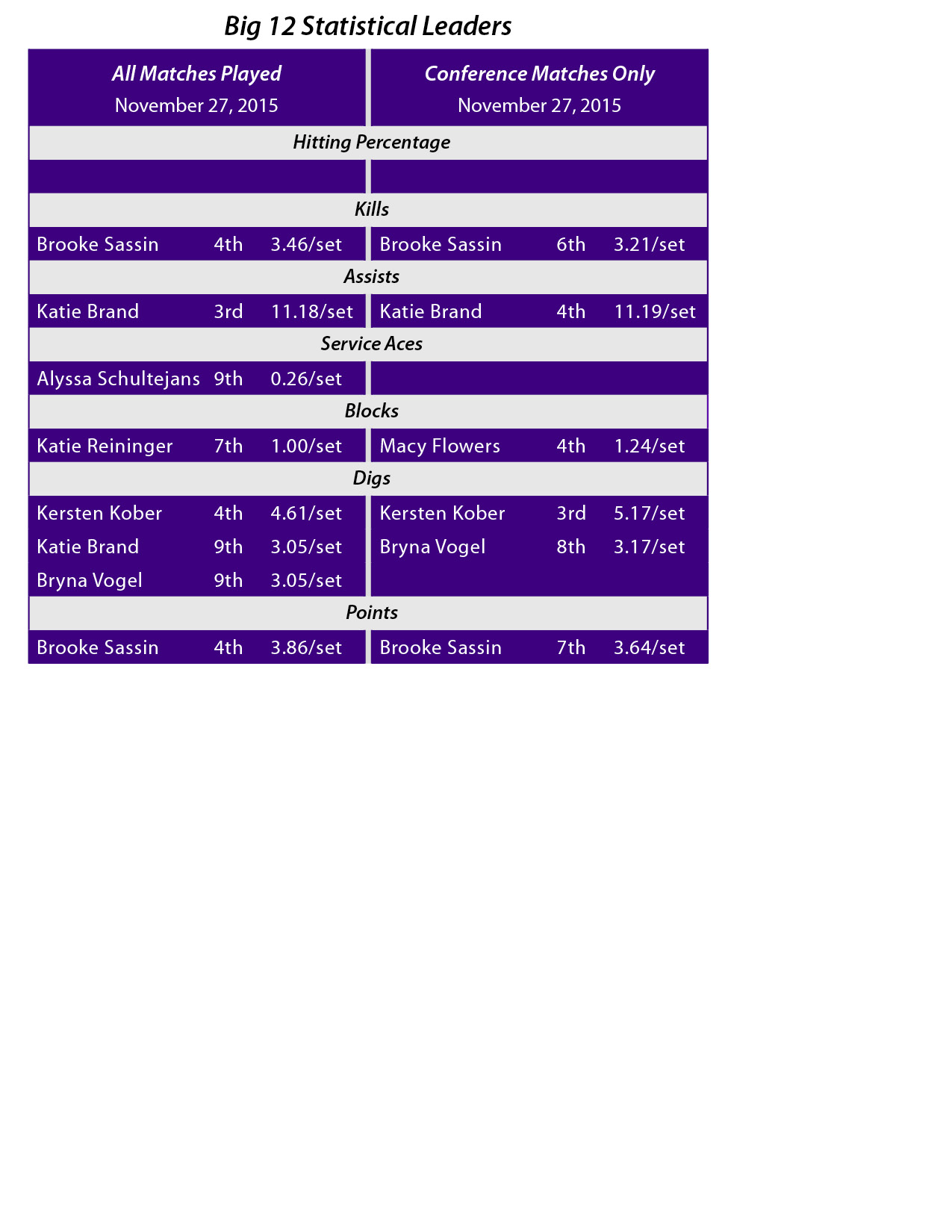 Brooke Sassin led with 16 points and 15 kills. Although she hit a modest .128, she was a big factor in tonight's victory. Her work tonight moves her up to #3 in kills in Big 12 in conference matches, at 3.29 per set.