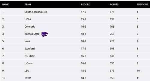 His K-State record is 145-110. Kansas State returns seven letter winners including all five starters from last season. The Wildcats will be led by All-American center Ayoka Lee and the sophomore trio of Brylee Glenn, Jaelyn Glenn and Serena Sundell.