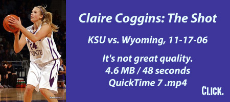 3/17/07 Were you there for that awesome win? Coach P had a great game plan. She must have seen something on tape, and she had the Cats focus on aggressive plays in the lane. Dietz, Coggins, Kincaid and Sweat had double-figure scoring, with Ashley leading the way with 15 points. K-State easily survived to play again on Thursday evening, vs. an unknown opponent. Remember the sellout we had for the WNIT championship on March 31, 2006? That's what we need on Thursday. We have a great bunch of players. If anyone gave up on them because February didn't go well, you might want to rethink that. I haven't seen the Cats more upbeat and ready to play than they were tonight. Be there!