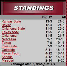 In the March 3 AP poll, K-State's #19. Baylor's #8, Oklahoma's #11, Texas A&M's #17 and Okie State is #20.