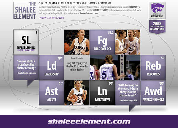 | 11/10/08 Shalee Lehning is a Wooden Award candidate! It's wonderful, and not the least surprising, that K-State's own Shalee Lehning is one of 30 candidates for the Wooden Award, described as the most prestigious individual award in college basketball. Sports Information has put together an excellent announcement, and I will let them fill in the details. Other candidates from around the Big 12 are Takia Starks of Texas A&M, Courtney Paris of Oklahoma and Andrea Riley from Oklahoma State. Here's a direct link to the Wooden Award site. Congratulations to Shalee. Regardless of the outcome, we all know what a tremendous competitor and representative of K-State she is. This just in... click on the screen capture below to visit a very cool Web site promoting Shalee for the award. ![]() |